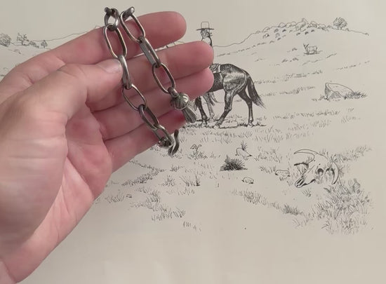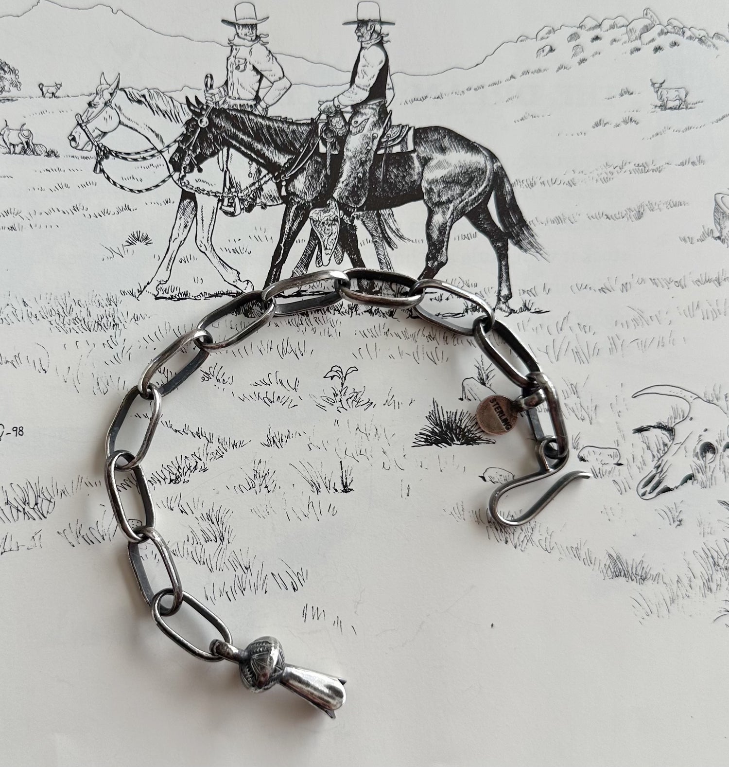 Sterling silver handmade heavy link bracelet adorned with a hand fabricated, stamped, & engraved Sterling squash blossom charm.