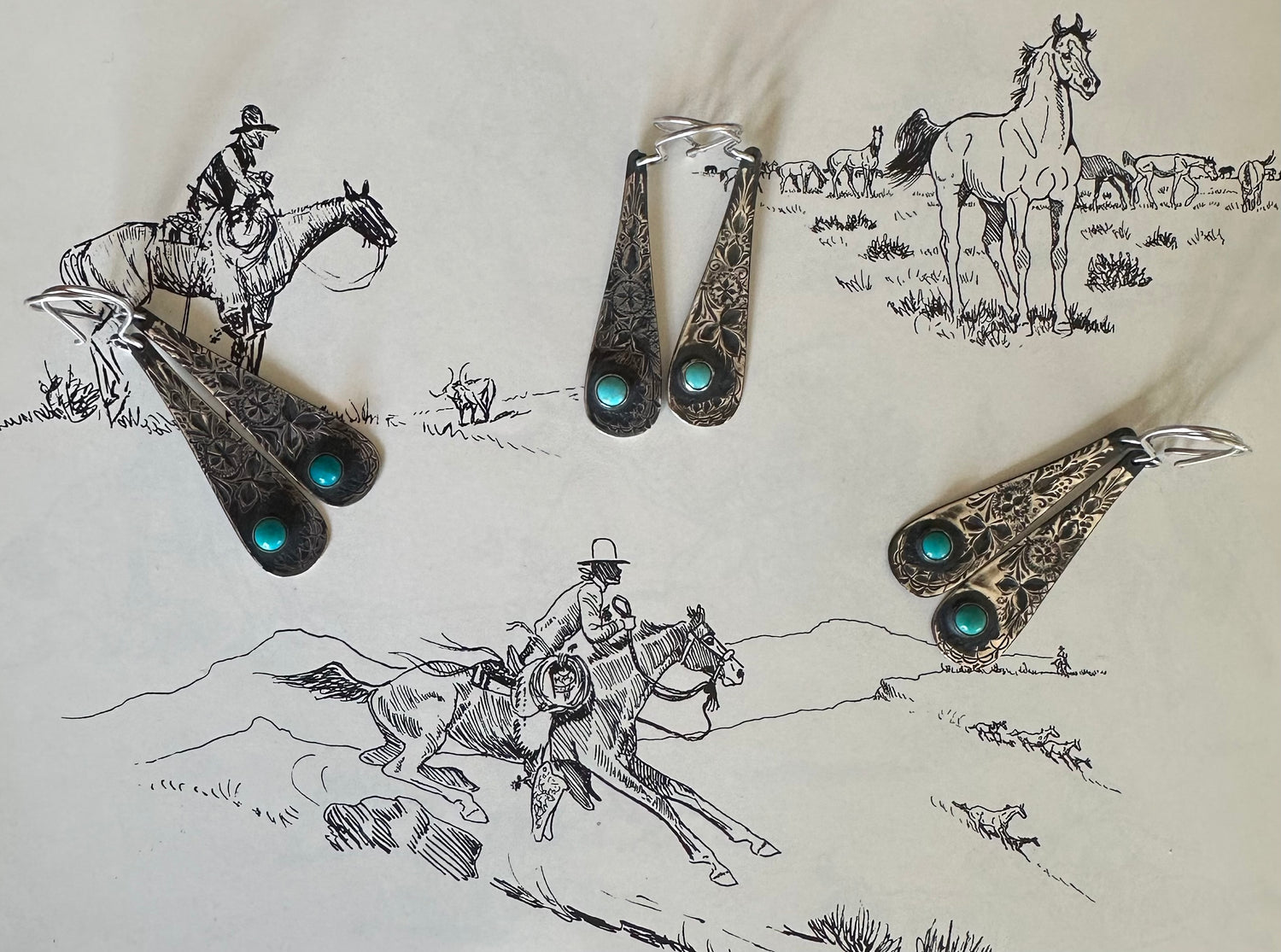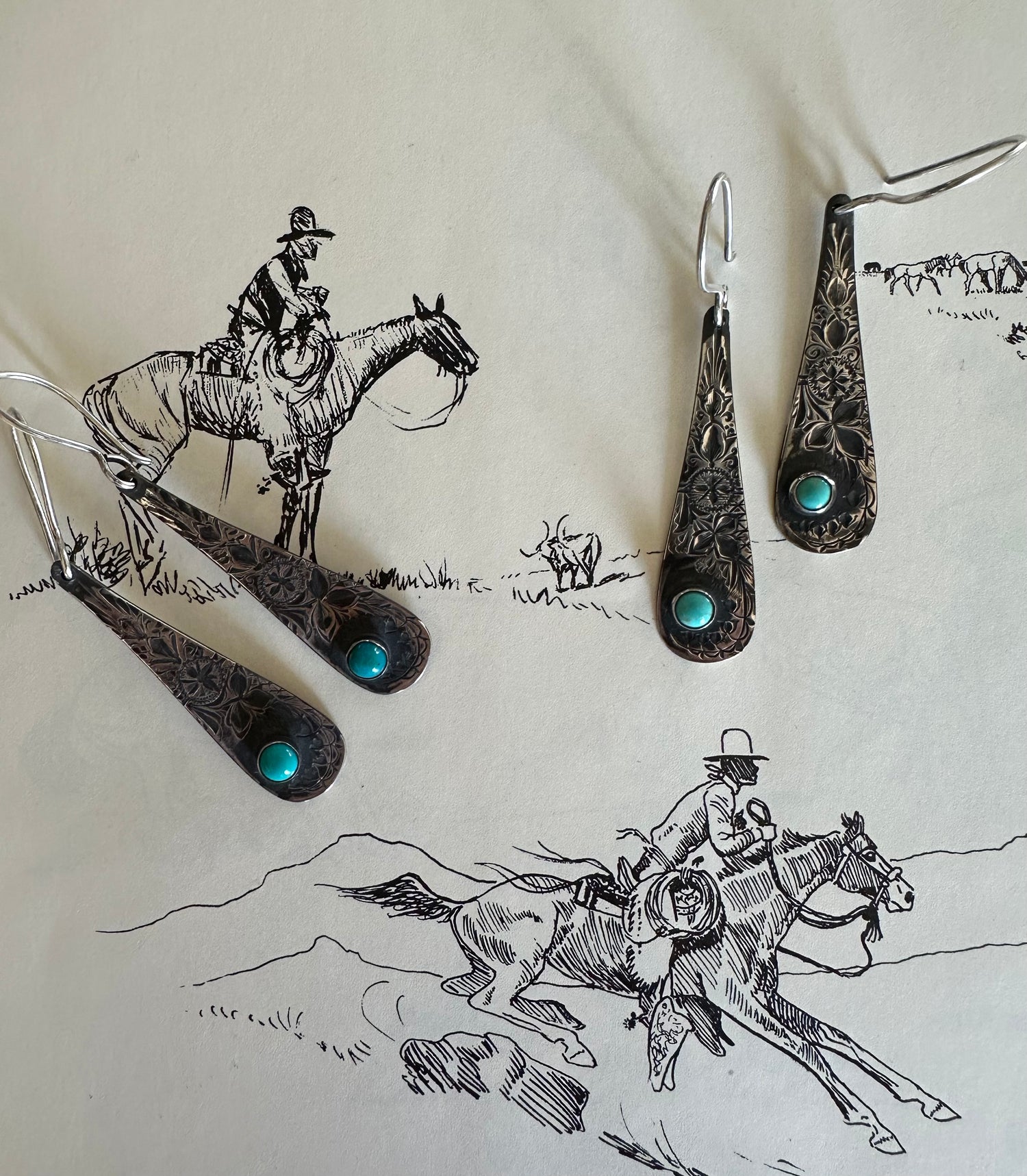 Sterling silver engraved spoon earrings with Sonoran Turquoise